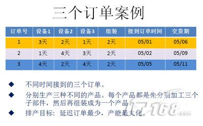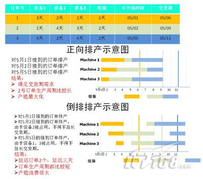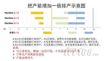 在正常排产情况,一个订单生产周期的长短一定是和设备资源配置有关。如果在一段时间内,设备资源保证(或者优先)这个订单的需求,不要发生设备资源冲突,那么,这个订单的生产周期将可能最短。ERP就是按照这个原则排出的生产计划,如同上一节所讲。按照倒排(拉动式)方式,每排产一个订单计划,就把相应的设备资源占用了,并且不考虑这些资源在这个订单执行期间是否可以给其他订单使用。如果ERP评估某个资源的能力不足,就会调整延长加工时间,保证设备的使用。