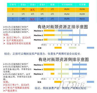 从倒排的案例说明,实现最短生产周期一定是牺牲设备使用率也就是牺牲产能为代价的。在大批量、品种少、专线生产的模式下,一定存在绝对瓶颈资源,决定了生产线的产能。在产能范围内,如果有订单,不会有资源冲突,无非是先做哪个订单。其他资源则可以调配使用。例如印厂的印刷机和裁纸机、装订机的关系。在这种情况下,不存在牺牲产能,所以,ERP的排产方式是可行的,具有工期最短优势的。